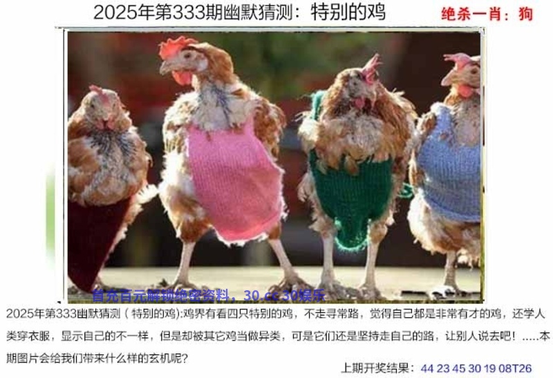 鸡界有看四只特别的鸡,不走寻常路,觉得自己都是非常有才的鸡,还学人类穿衣服,显示自己的不一样,但是却被其它鸡当做异类,可是它们还是坚持走自己的路,让别人说去吧!……本期图片会给我们带来什么样的玄机呢? 解:明肖鸡 推荐生肖:鸡猪蛇虎马 |